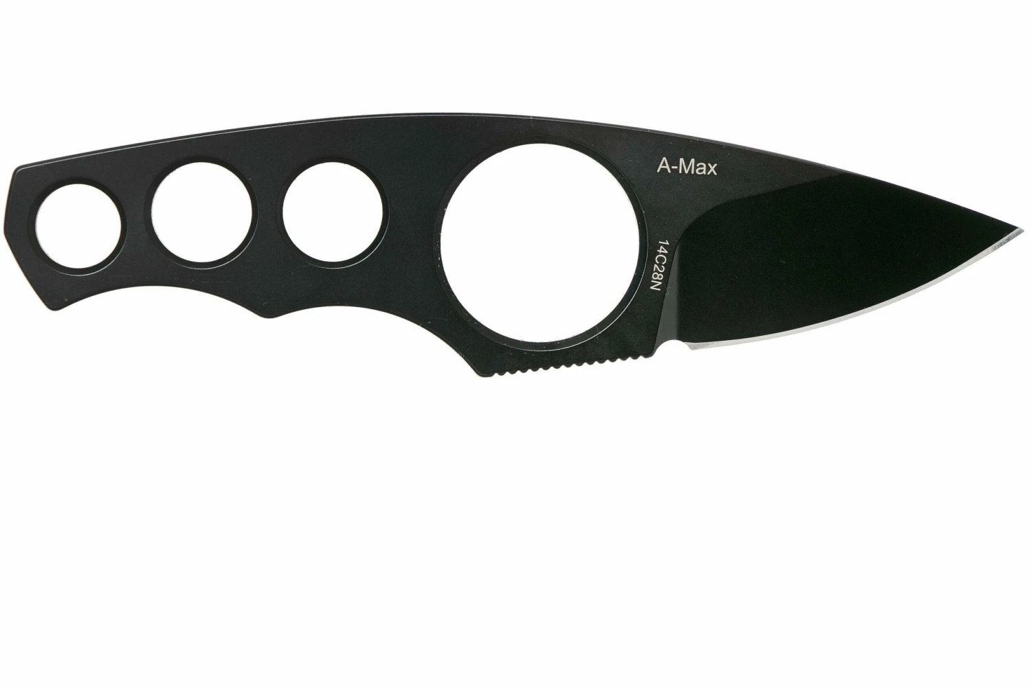 El Amare Knives A-Max es un cuchillo fijo compacto, diseñado por Uli Hennicke. Diseñó el A-Max como un cuchillo de cuello para llevar todos los días. Este cuchillo se lleva en su funda de kydex alrededor del cuello con el cordón de cuello. Así, siempre lo tienes cerca.