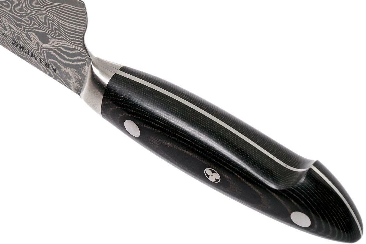 El cuchillo de chef Bob Kramer by Zwilling Euro Stainless, 16 cm impresiona por el espectacular dibujo de la hoja. Con una hoja de 16 cm y un mango firme, el cuchillo se adapta perfectamente a la mano. Toda la longitud de la hoja ha sido afilada. Como resultado, se puede utilizar toda la hoja. Debido a la longitud y la altura de la hoja, este cuchillo es perfecto para cortar verduras, carne, pescado y fruta. Pero también para picar hierbas y pelar dientes de ajo. Este cuchillo está hecho con un solo propósito: ofrecerte excelentes propiedades de corte.