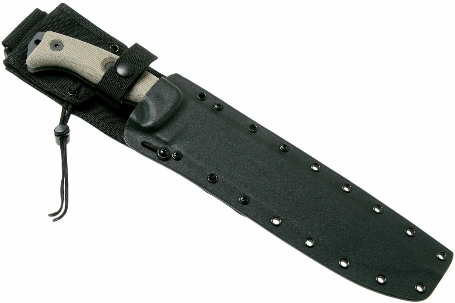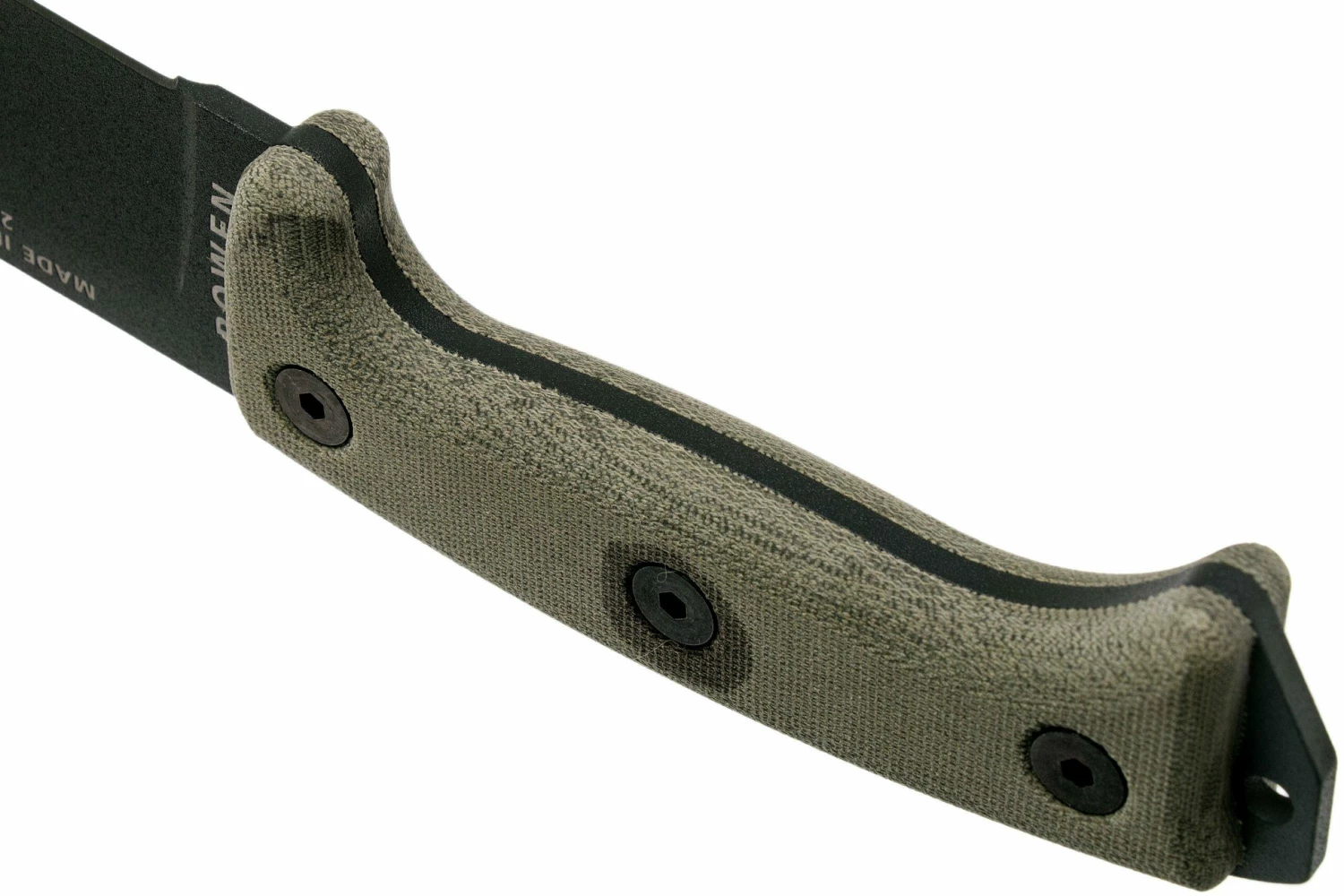 El ESEE Junglas es el cuchillo definitivo para todos los que piensan que su machete es un poco demasiado grande, pero siguen buscando un cuchillo grande con el que poder picar. Mientras que muchos machetes apenas están afilados para cortar, el Junglas está afilado como una navaja. También es bonito y pesado para que picar sea un juego de niños. El mango de micarta es grande y de forma ergonómica. El tacto es un poco áspero, lo cual es genial para el agarre y la comodidad. Si es necesario, las cachas pueden retirarse fácilmente.