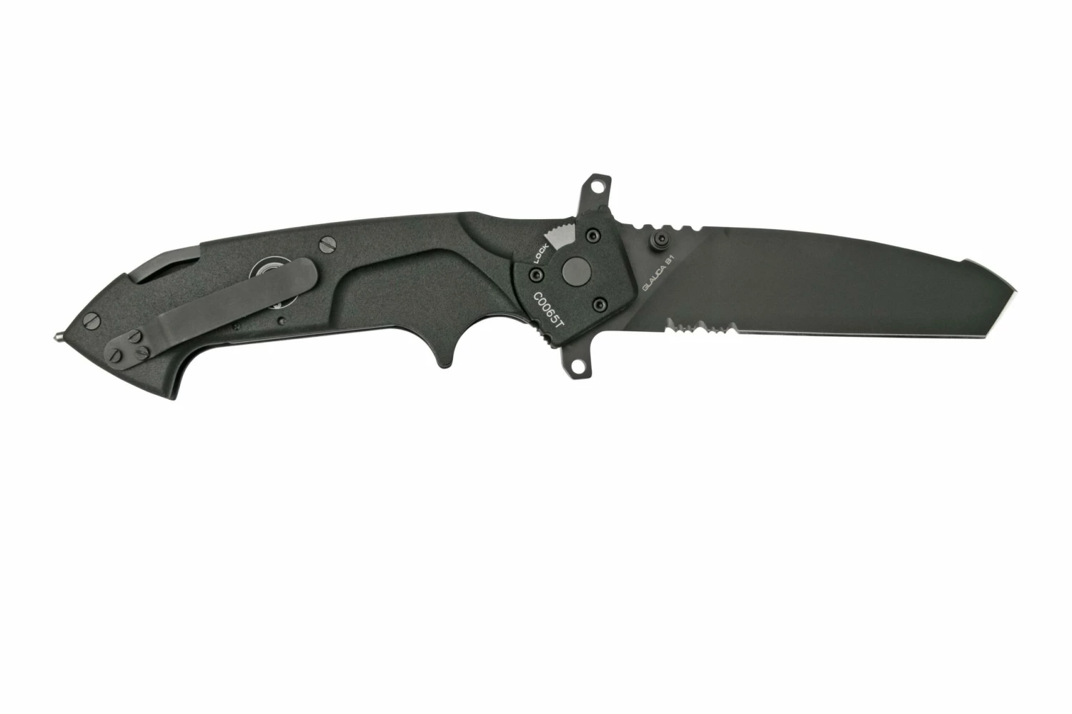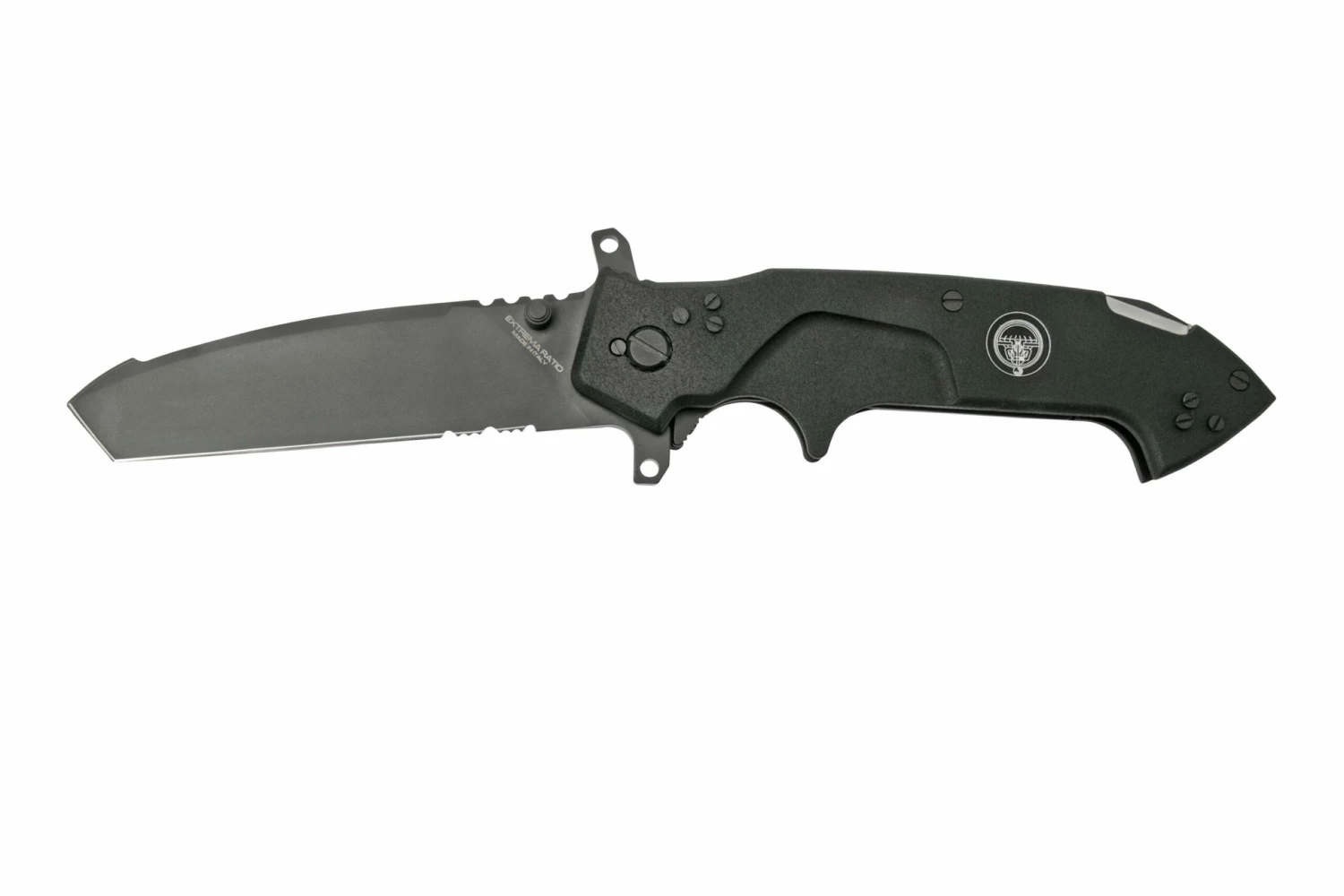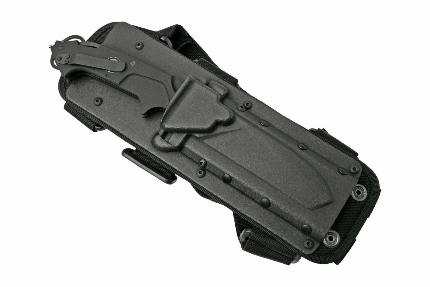 La Extrema Ratio Glauca B1 Tanto es una navaja versátil y táctica. El cuchillo está mejorado con un rompe cristales y una herramienta especial en el lomo del mango para cortar las esposas de plástico. Esta herramienta funciona como un cúter y se utiliza haciendo clic en el backspacer del mango. Funciona como un mango para los alicates.