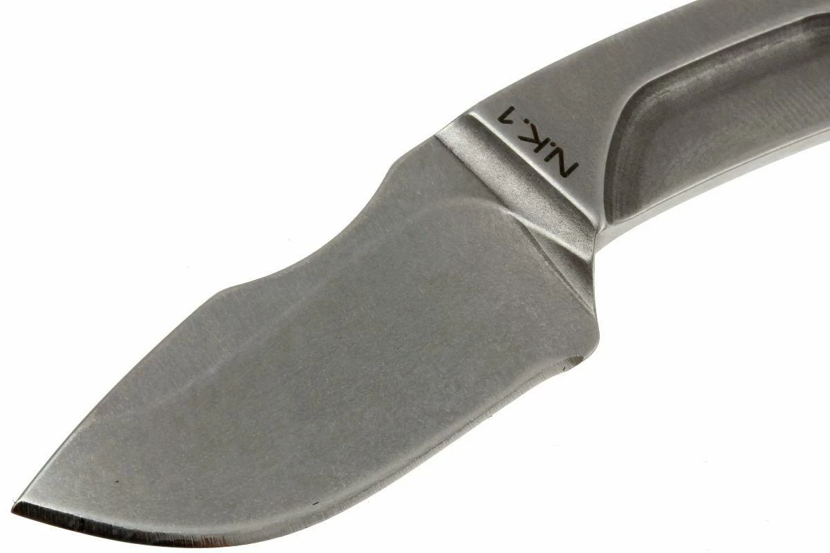 El Extrema Ratio N.K.1 es un cuchillo de cuello compacto, con mango completo. La forma de la hoja se basa en la forma de un cuchillo desollador. Esto hace que sea ideal durante la caza, para quitar la piel de la caza abatida. El mango es muy cómodo de usar, especialmente si se tiene en cuenta el tamaño del cuchillo. El recorte en la parte posterior de la hoja hace que también se pueda utilizar muy bien el pulgar al sujetar el cuchillo.