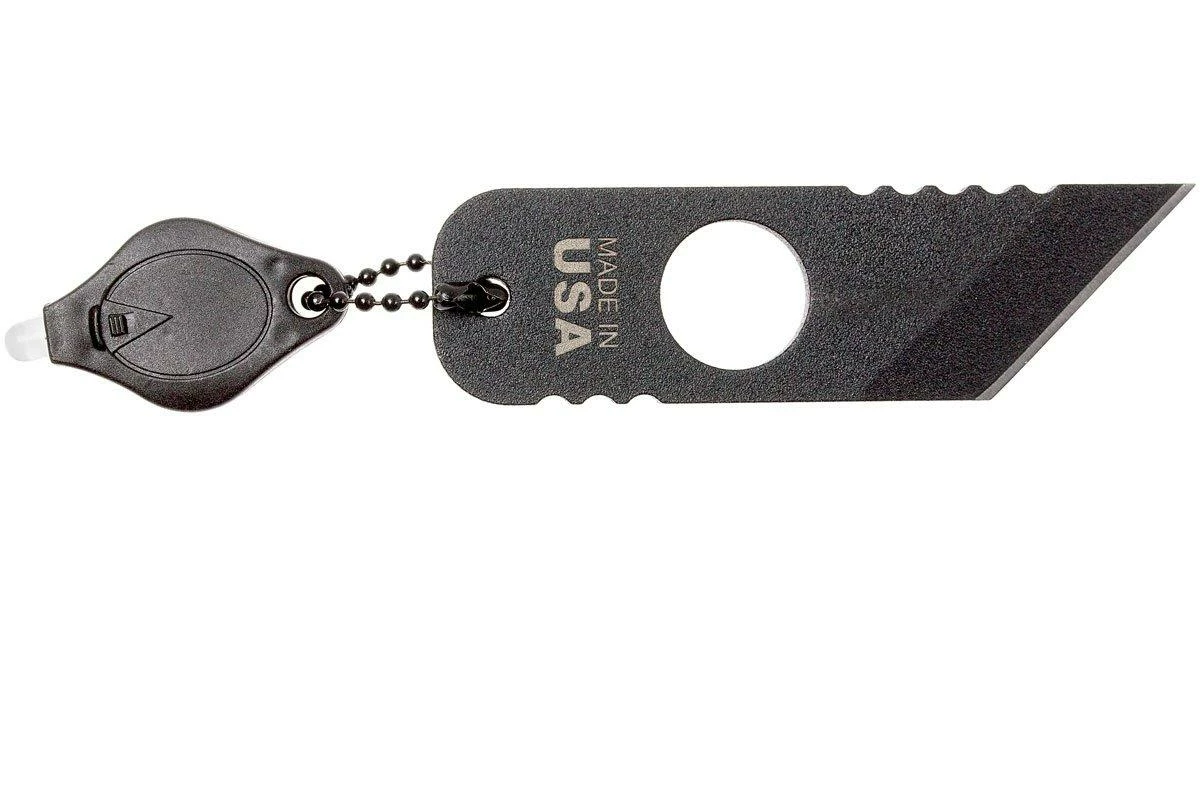 El TOPS ALRT-01 es un pequeño cuchillo de cuello diseñado para emergencias. Se podría decir que los cuchillos no son más sencillos que esto: una hoja de acero con un filo afilado. Sin embargo, si se mira un poco más de cerca, se verá que este cuchillo ha sido bien pensado. Las estrías de agarre, también conocidas como jimping, se han aplicado en todos los lugares adecuados. Se ha perforado un agujero en el centro del mango. En parte para ahorrar peso, pero también para poder pasar un dedo por él, lo que permite un excelente agarre de este pequeño cuchillo.